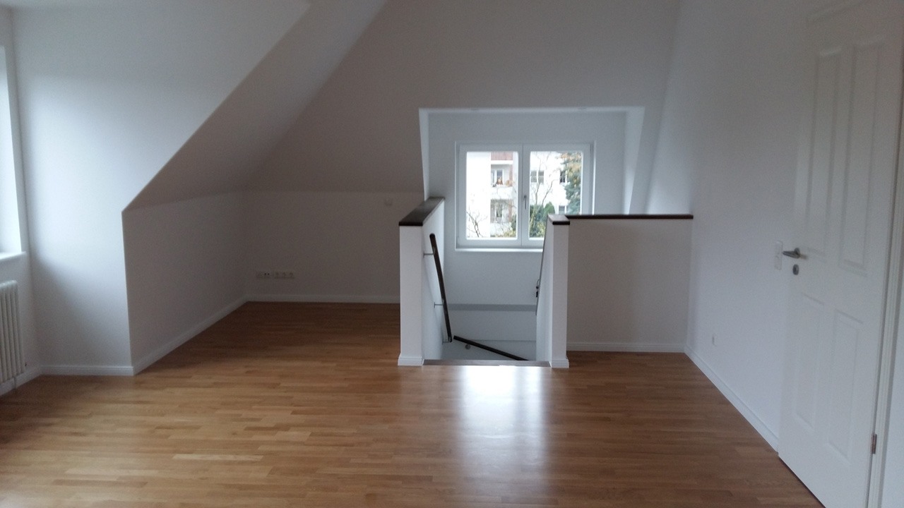 Die Eigentümer wollten ein Mietobjekt für eine große Familie anbieten. Der anfänglich positive erste Eindruck des Objektes verdüsterte sich nach intensiver Besichtigung. Wir mussten feststellen, dass die Decken und der Dachstuhl nicht mehr erhaltenswert waren. Eine Außenwand wurde in Kriegszeiten von einer Luftmiene getroffen und nur mäßig instandgesetzt. Zur Planung gehörte der Bauantrag mit Statik, ein Brandschutzkonzept und ein geforderter zweiter Rettungsweg. Nach erteilter Baugenehmigung wurde das Haus entkernt. Alle nicht notwendigen Wände und die Geschosstreppen wurden bei der Gelegenheit entfernt. Der neue Dachstuhl mit vier Gauben erlauben eine komplette Nutzung mit zusätzlichen Bad und Abgang des Rettungsweges auf dem darunterliegenden Balkon. Nach Instandsetzung der Außenwände konnten Holzfenster verbaut, Elektroleitungen verlegt, Putz aufgebracht werden und der Innenausbau beginnen. Das Dachgeschoss mit Bad, Blick zum First und allseitige Fenster ist lichtdurchflutet und ein Bereich der intensiv genutzt werden wird. Die neue Holztreppe angepasst an dem Bestand, mit weißen Wangen und dunklen Stufen wirkt für sich. Teilweise im nostalgisches Flair entstand mit entsprechenden Bodenfliesen und Sanitärkeramik, gemischt mit neuer Technik, großen modernen Fliesen und alten Holzböden. Im Außenbereich entstanden zusätzliche Stellplätze.